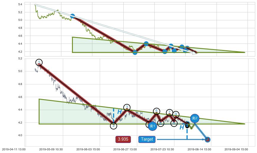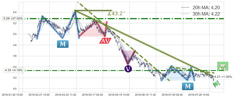 🦴 长线均值回复组合短线趋势跟踪[强阻力信号]2019-03-21 13:00-2019-07-31 15:00下跌趋势依然成立(下跌趋势跟踪依然存在),短线价格略微上行反弹(均值回复猜想),即将接近下跌趋势提供的未破位阻力价格:4.21。