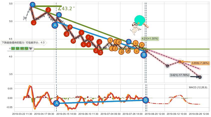 ➣ 预测:2019-09-05 12:00,【试探阻力】稳定目前下跌趋势的前提下,预测价格:3.858