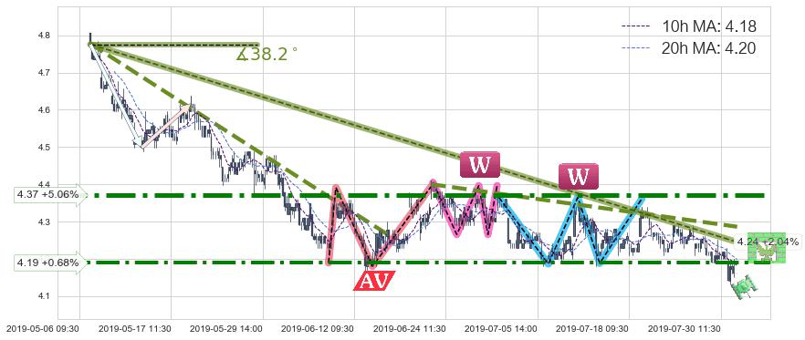♘ 阻力价格位4.19,可信任强度73.00%,距离最后交易2019-07-31 15:00形成的收盘价格4.16相差 +0.68%