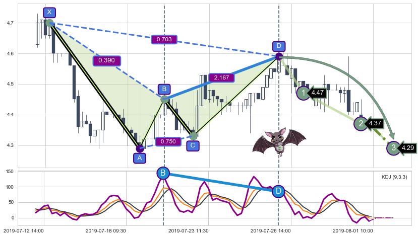 ➣ 已完成【蝙蝠】形态起点X: 07-12:15, 终点D: 07-26:10, 共57交易小时