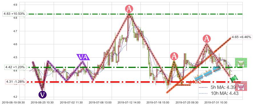 ♘ 阻力价格位4.42,可信任强度73.08%,距离最后交易2019-07-31 15:00形成的收盘价格4.37相差 +1.23%