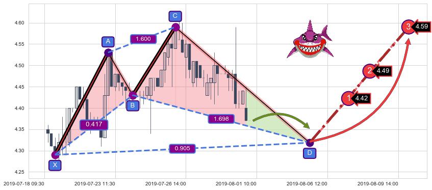 ➢ 接近预测D点位置, 随时警戒看涨【鲨鱼】形态反转启动