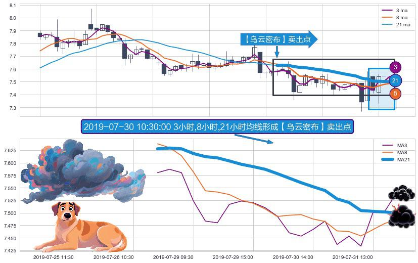 ⚀ 2019-07-26 13:00:00小时-2019-07-31 15:00:00小时显现 3小时-8小时-21小时均线 【乌云密布】卖出点 看空信号,后市看跌,卖出