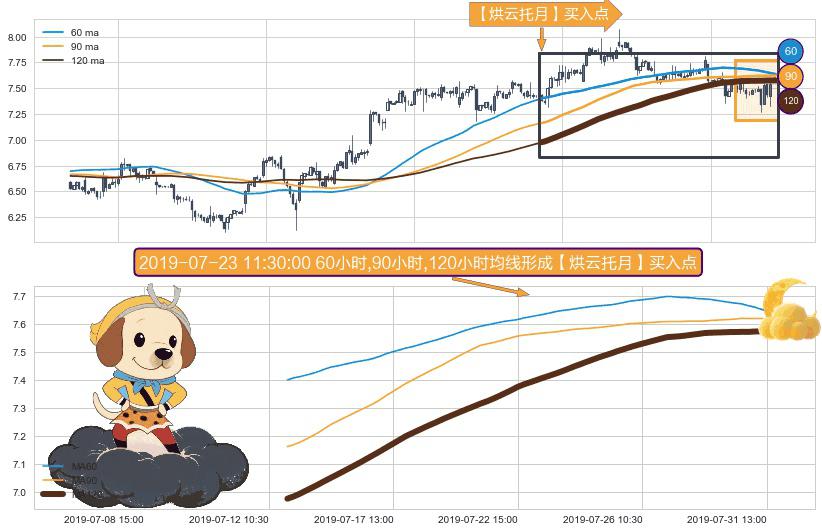⚀ 2019-07-12 14:00:00小时-2019-07-31 15:00:00小时显现 60小时-90小时-120小时均线 【烘云托月】买入点 看多信号,后市看涨,买入