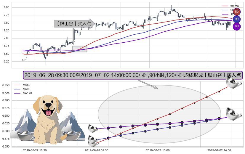 ⚀ 2019-06-28 10:30:00-小时至2019-07-02 14:00:00-小时显现 60小时-90小时-120小时均线 【银山谷】买入点 看多信号,后市看涨,买入