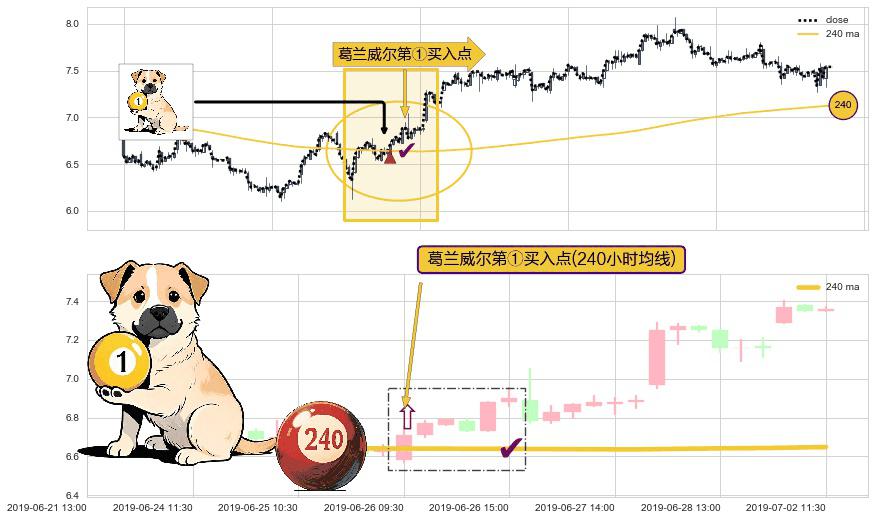⚀ 2019-06-26 09:30:00-小时显现 葛兰威尔均线 240小时均线 第买①入点 走势反转见底信号,后市看涨,买进信号