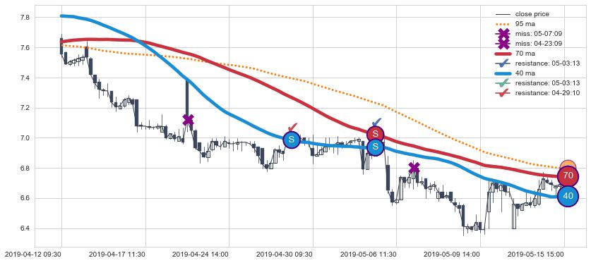 06-07 14:00至07-13 10:30 慢线与快线呈空头排列, 慢线与快线接触少,无缠绕