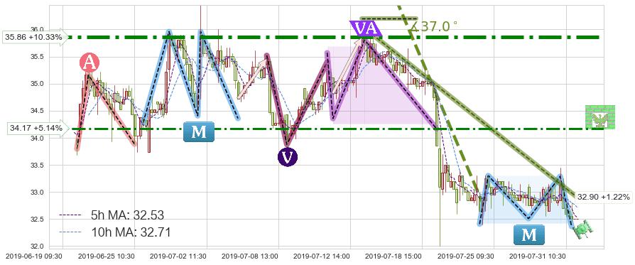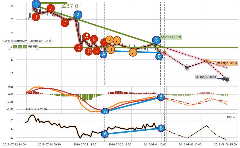 ➣ 预测:2019-08-06 15:00,【试探阻力】稳定目前下跌趋势的前提下,预测价格:31.88
