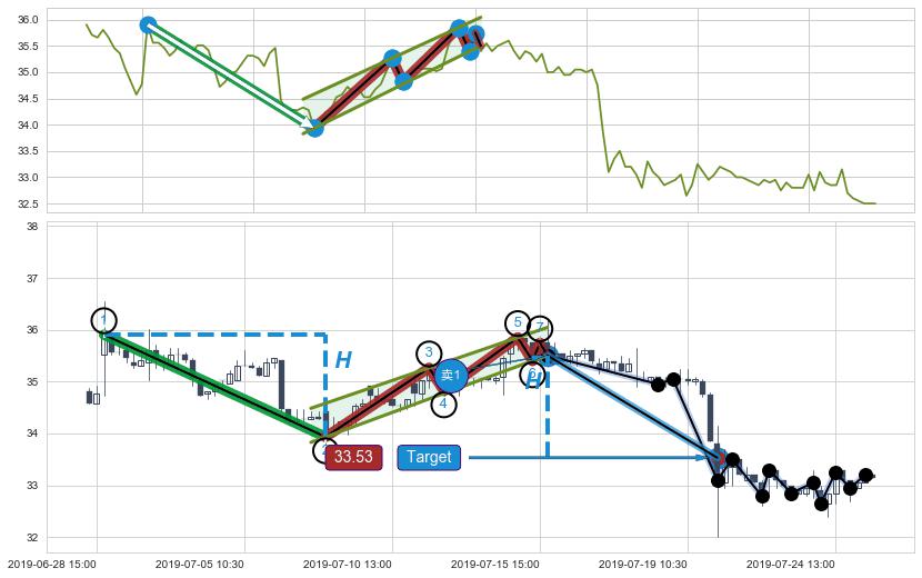 从2019-07-22 15:00至2019-07-31 15:00,共包含43个小时,阶段股价下跌-0.85%,阶段股价变动位移路程比: 1 : 20