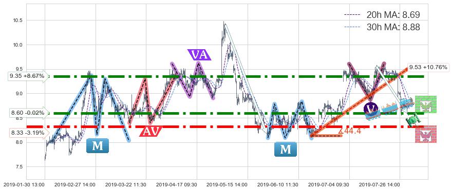 ♘ 支撑价格位8.33,可信任强度95.40%,距离最后交易2019-07-31 15:00形成的收盘价格8.60相差 -3.19%