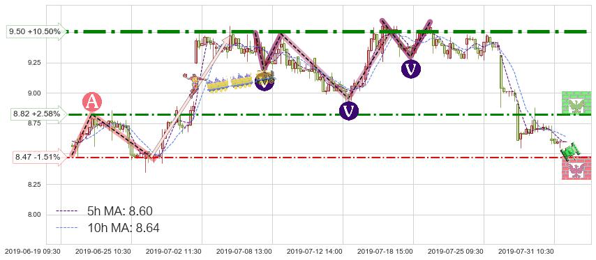 ♘ 阻力价格位8.82,可信任强度58.39%,距离最后交易2019-07-31 15:00形成的收盘价格8.60相差 +2.58%