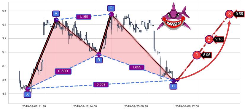 | 10 🅚:上升覆盖线 ➕ 📡:谐波鲨鱼已到达d点:猜想c下行到达d点后报复性拉升上涨(均值回复) ☞ 看多信号 ⇥ 【🅚线】交织【图形】⇥ 综合量化分数: 56 | > |
