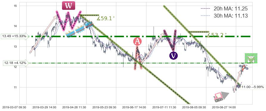 从2019-07-02 14:00至2019-08-30 10:30,共包含256个小时,阶段股价下跌-13.69%,阶段股价变动位移路程比: 1 : 8,下跌趋势角度: 53.2