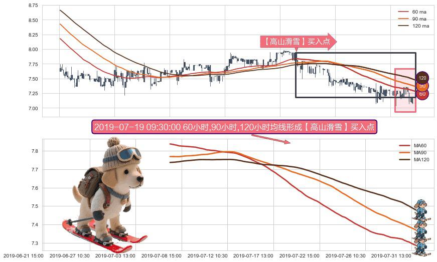 形态多维评估: ⚀ 2019-07-08 09:30:00小时-2019-07-31 15:00:00小时显现 60小时-90小时-120小时均线 【高山滑雪】买入点 看多信号,后市看涨,买入
