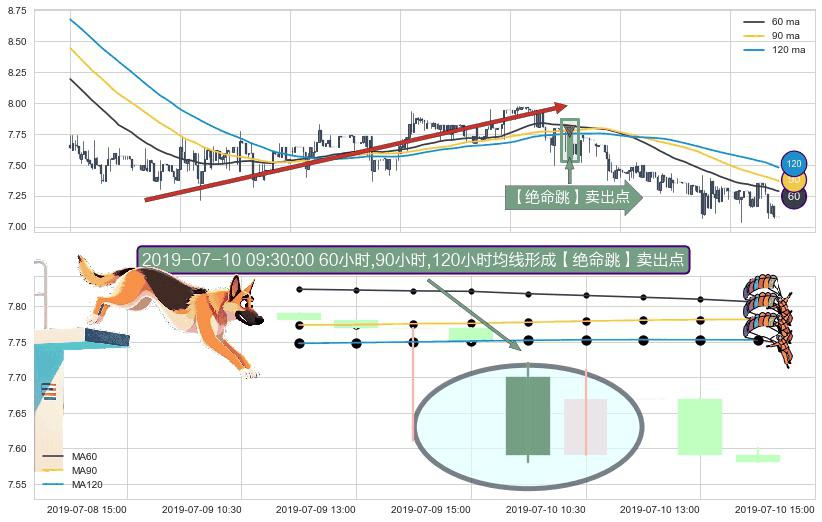 形态多维评估: ⚀ 2019-07-10 09:30:00小时显现 60小时-90小时-120小时均线 【绝命跳】卖出点 看空信号,后市看跌,卖出