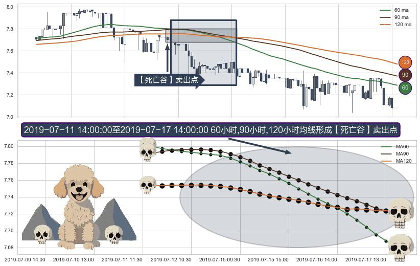 形态多维评估: ⚀ 2019-07-11 15:00:00-小时至2019-07-17 14:00:00-小时显现 60小时-90小时-120小时均线 【死亡谷】卖出点 看空信号,后市看跌,卖出