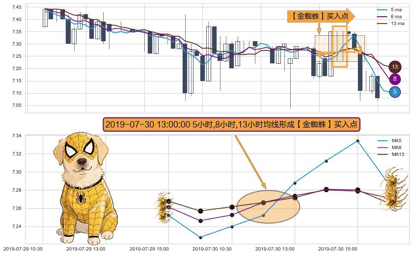 形态多维评估: ⚀ 2019-07-30 13:00:00小时显现 5小时-8小时-13小时均线 【金蜘蛛】买入点 看多信号,后市看涨,买入