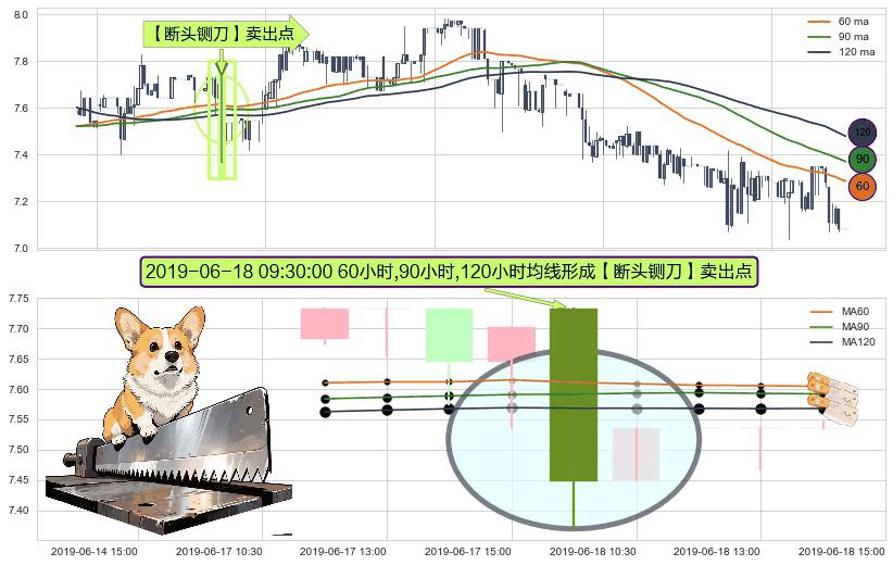 形态多维评估: ⚀ 2019-06-18 09:30:00小时显现 60小时-90小时-120小时均线 【断头铡刀】卖出点 看空信号,后市看跌,卖出