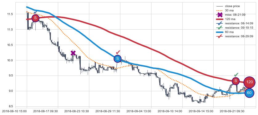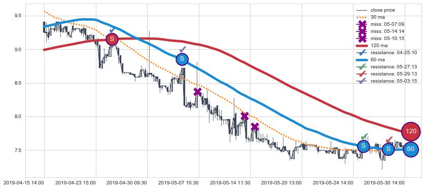下跌趋势04-15 14:00-05-30 14:00,均线120, 60确认关键阻力4处