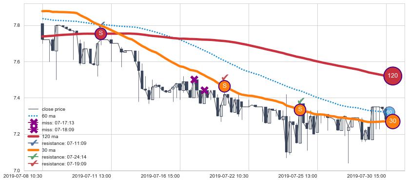 下跌趋势07-08 10:30-07-30 15:00,均线120, 30确认关键阻力3处