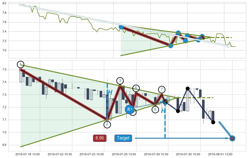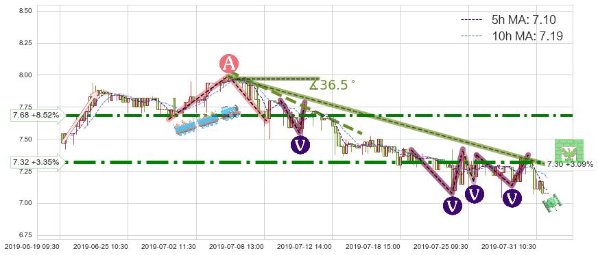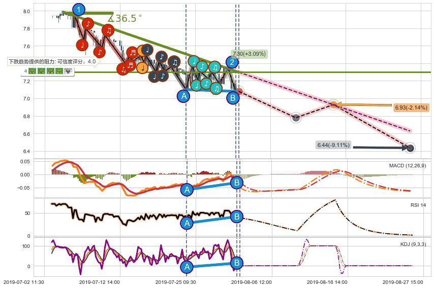 ➣ 预测:2019-08-15 12:00,【试探阻力】稳定目前下跌趋势的前提下,预测价格:6.93