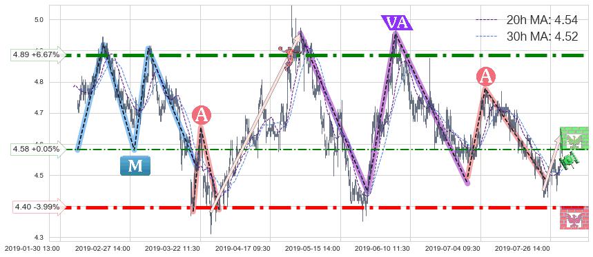 ♘ 阻力价格位4.58,可信任强度46.35%,距离最后交易2019-07-31 15:00形成的收盘价格4.58相差 +0.05%