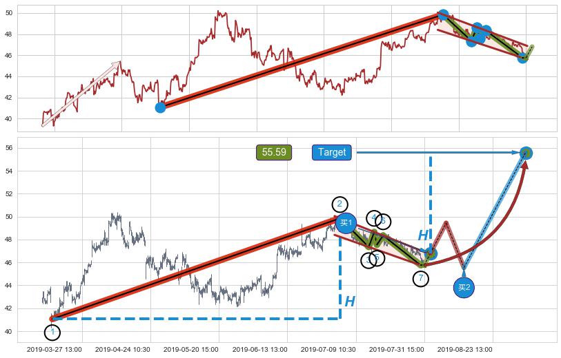 从2019-01-30 14:00至2019-02-22 09:30,共包含78个小时,阶段股价上涨7.68%,阶段股价变动位移路程比: 1 : 6
