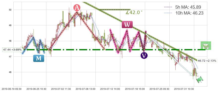 ➣ 预测:2019-08-07 15:00,【继续下探】稳定目前下跌趋势的前提下,预测价格:44.95