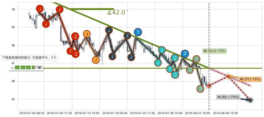 ♘ 在最后的下跌阶段2019-07-03 11:30至2019-07-31 14:00,存在 持续未破位的阻力位 ,阻力价格46.72,可信任强度81.49%,其距离最后价格45.75相差 +2.13%