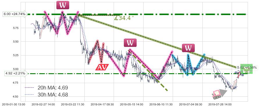 ♘ 阻力价格位6.00,可信任强度95.59%,距离最后交易2019-07-31 15:00形成的收盘价格4.81相差 +24.74%