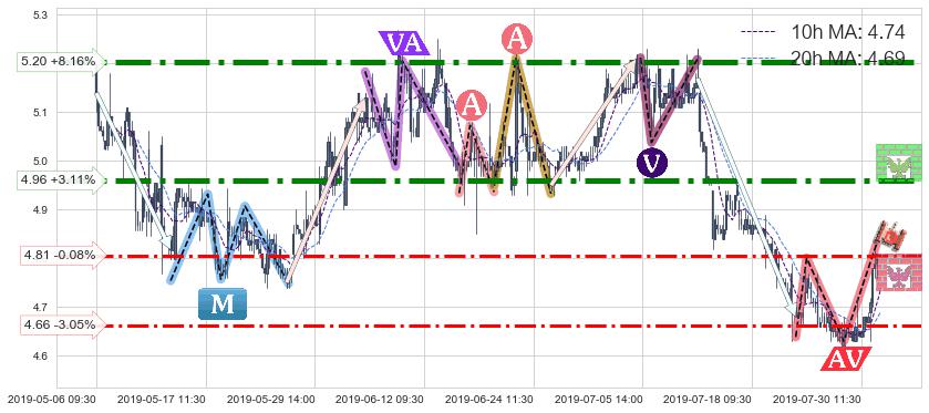 ♘ 阻力价格位5.20,可信任强度96.82%,距离最后交易2019-07-31 15:00形成的收盘价格4.81相差 +8.16%