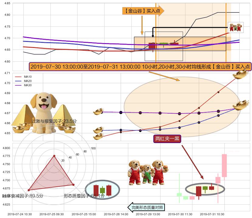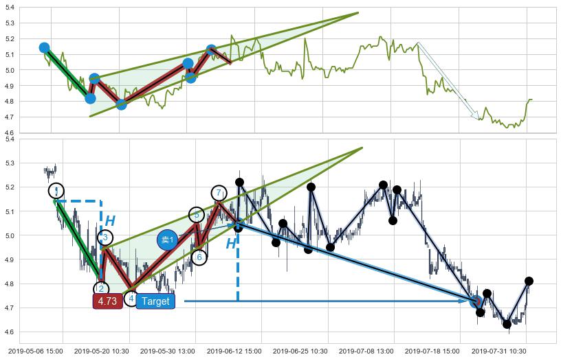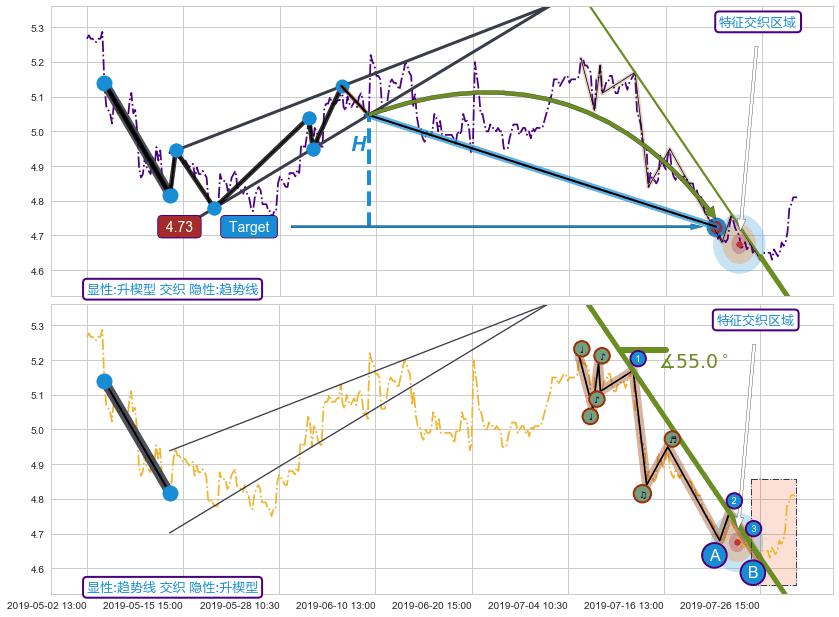 从2019-07-23 11:30至2019-07-31 15:00,共包含40个小时,阶段股价上涨2.78%,阶段股价变动位移路程比: 1 : 4