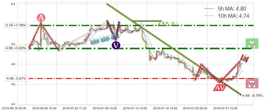 ⚔️ 2019-07-05 10:30-2019-07-26 14:00下跌趋势存在反转上涨[机会],其原下跌趋势的阻力位(4.48)已被突破[强支撑信号],原下跌趋势角度: 55.0˚
