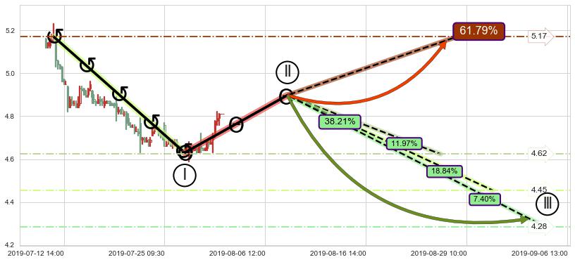 从2019-06-25 13:00至2019-07-05 10:30,共包含41个小时,阶段股价上涨5.14%,阶段股价变动位移路程比: 1 : 1.9