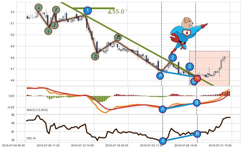 从2019-07-23 11:30至2019-07-31 15:00,共包含40个小时,阶段股价上涨2.78%,阶段股价变动位移路程比: 1 : 4