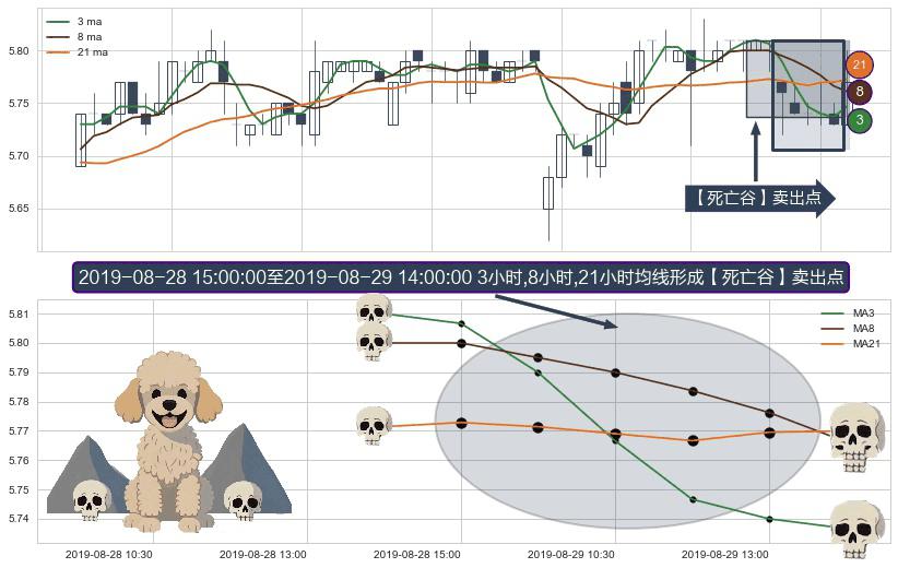 ⚀ 2019-08-29 09:30:00-小时至2019-08-29 14:00:00-小时显现 3小时-8小时-21小时均线 【死亡谷】卖出点 看空信号,后市看跌,卖出