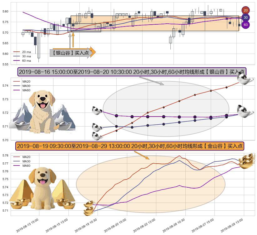 ⚄ 2019-08-19 10:30:00-小时至2019-08-29 13:00:00-小时显现 20小时-30小时-60小时均线 【金山谷】买入点 其再次确认了买入信号,可靠性更强,买入