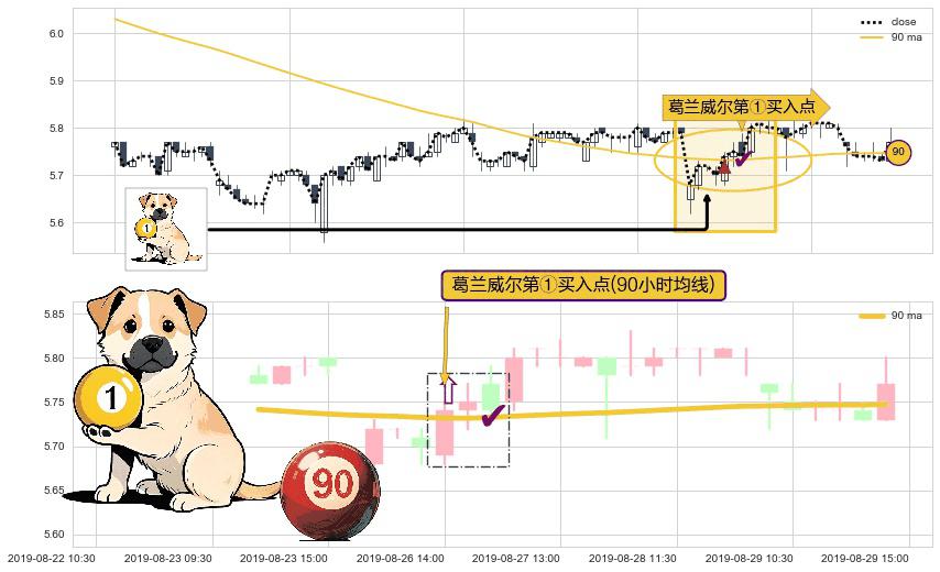 ⚀ 2019-08-26 14:00:00-小时显现 葛兰威尔均线 90小时均线 第买①入点 走势反转见底信号,后市看涨,买进信号