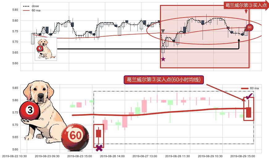 ⚀ 2019-08-29 15:00:00-小时显现 葛兰威尔均线 60小时均线 第③买入点 上升趋势的中继信号,后市看涨,买进信号