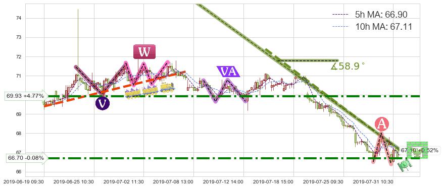 ➣ 预测:2019-08-06 15:00,【试探阻力】稳定目前下跌趋势的前提下,预测价格:65.30