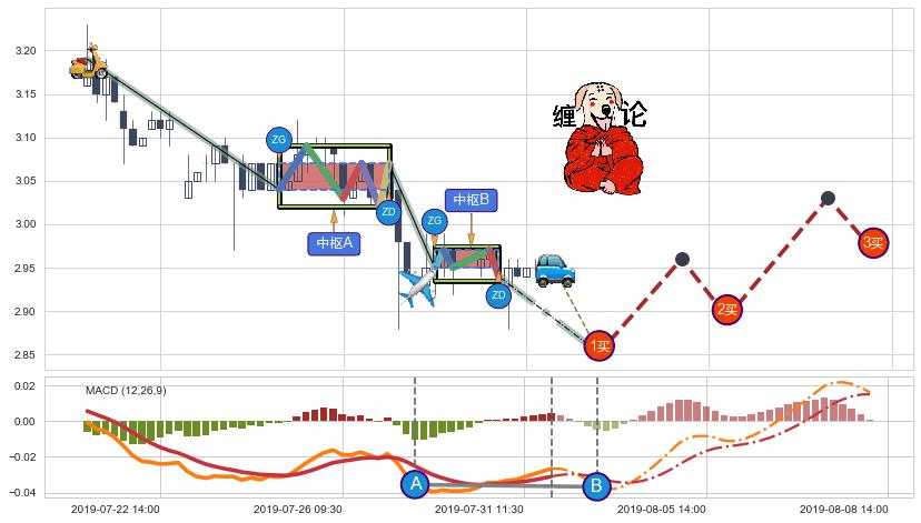 ➢ 【中枢B】:07-29:14-07-30:15,中枢由5笔构成,共8交易小时, ZG=2.970, ZD=2.950