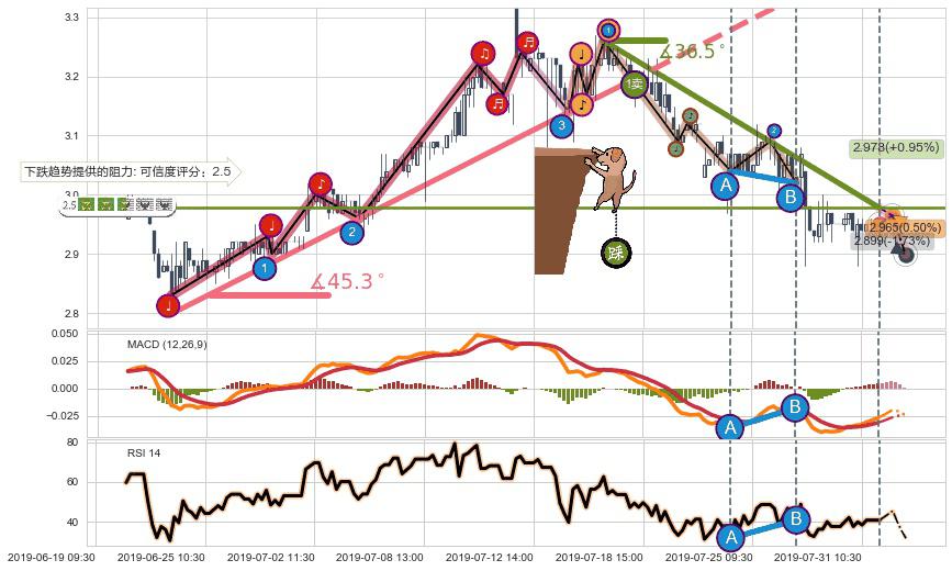 ♘ 在最后的下跌阶段2019-07-17 11:30至2019-07-30 13:00,存在 持续未破位的阻力位 ,阻力价格2.978,可信任强度68.74%,其距离最后价格2.950相差 +0.95%