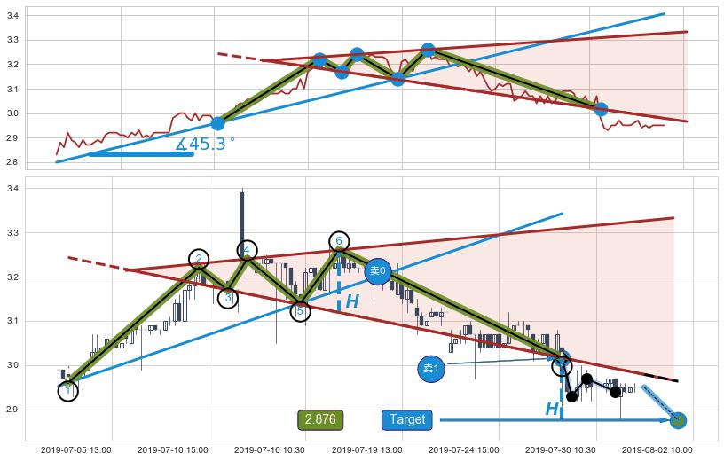 ➢ 最小反转跌幅→𝐇: 0.141111 (逐步抬高阻力斜边最后的阻力点⑥与支撑边垂直距离)