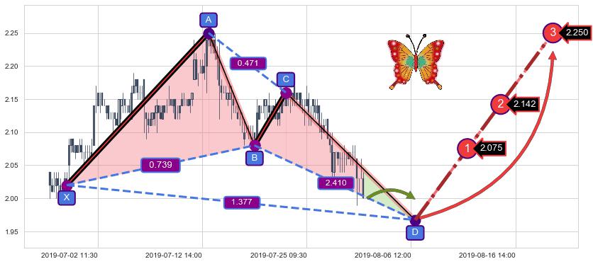 ➣ 未完成【蝴蝶】形态起点X: 06-26:15, 已到达C点: 07-23:11, 预测最终D点: 08-06:14, 共166交易小时