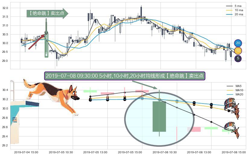 形态多维评估: ⚀ 2019-07-08 09:30:00小时显现 5小时-10小时-20小时均线 【绝命跳】卖出点 看空信号,后市看跌,卖出