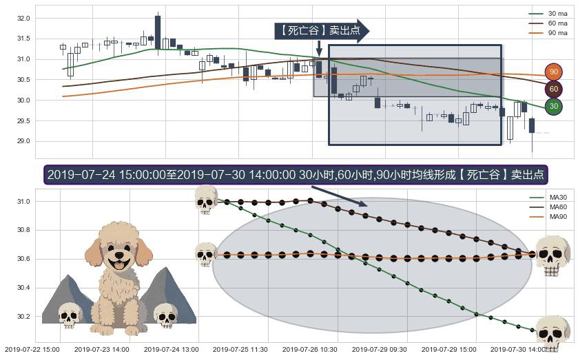形态多维评估: ⚀ 2019-07-25 09:30:00-小时至2019-07-30 14:00:00-小时显现 30小时-60小时-90小时均线 【死亡谷】卖出点 看空信号,后市看跌,卖出