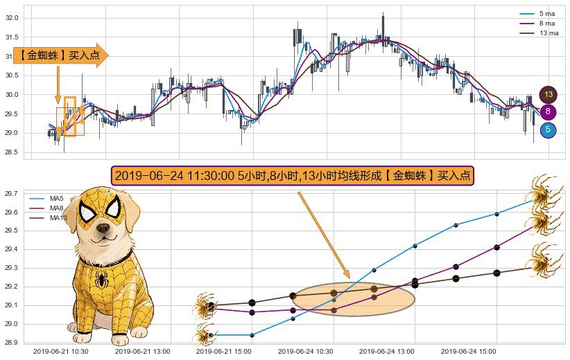 形态多维评估: ⚀ 2019-06-24 11:30:00小时显现 5小时-8小时-13小时均线 【金蜘蛛】买入点 看多信号,后市看涨,买入