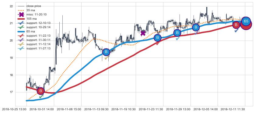 上涨趋势10-25 13:00-12-11 11:30,均线65, 105确认关键支撑6处
