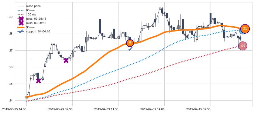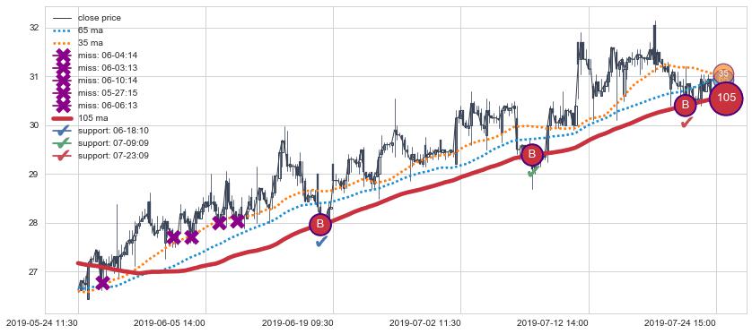 上涨趋势05-24 11:30-07-24 15:00,均线105确认关键支撑3处