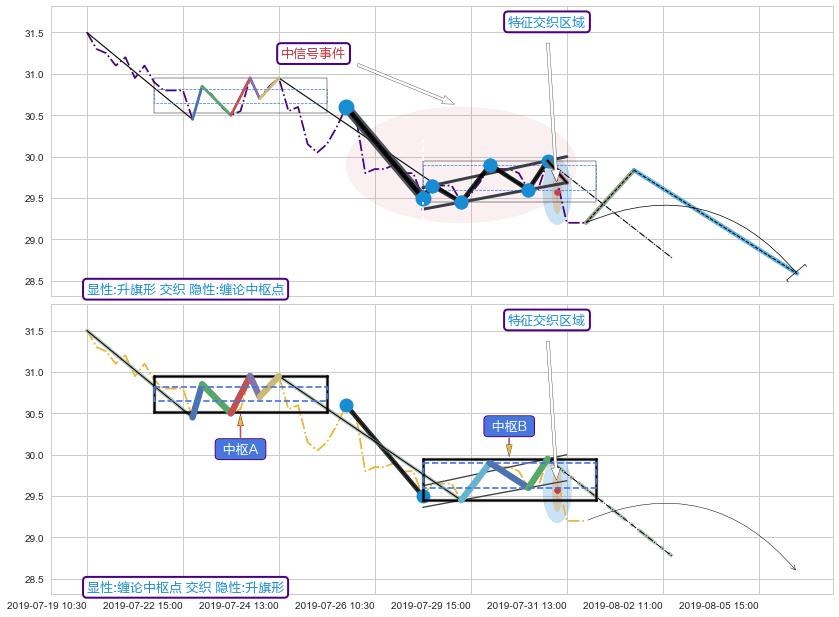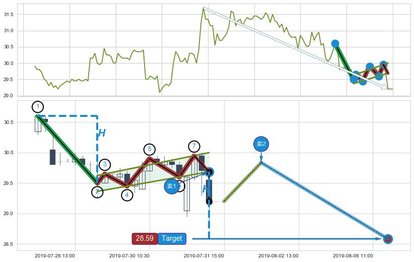 从2019-07-29 14:00至2019-07-31 15:00,共包含14个小时,阶段股价下跌-0.82%,阶段股价变动位移路程比: 1 : 7
